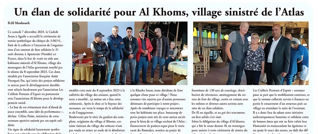Souss à Agadir a accueilli la cérémonie de remise symbolique du chèque de 3 063 €, fruit de la collecte à l'occasion de l'organisation d'un tournoi de foot solidaire le 31 août dernier, à Apremont (Vendée) en France, dans le but de venir en aide aux habitants sinistrés d'Al Khoms, village des montagnes de l'Atlas gravement touché par le séisme du 8 septembre 2023. Ces dons récoltés par l'association française Astür Pourquoi Pas, qui initie des projets solidaires et œuvre pour le développement durable, sont relayés localement par l'association Les Colibris Porteurs d'Espoir en partenariat avec l'association Al khoms pour le développement social.