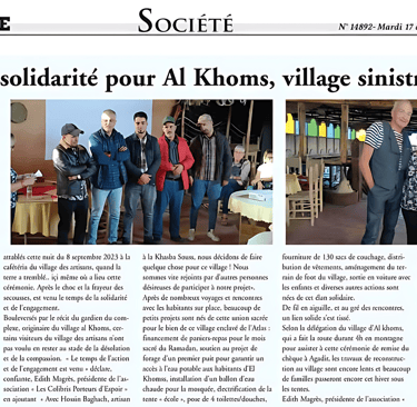 Bouleversés par le récit du gardien du complexe, originaire du village al Khoms, certains visiteurs du village des artisans n'ont pas voulu en rester au stade de la désolation et de la compassion. Le temps de l'action et de l'engagement est venu déclare, confiante, Edith Magrès, présidente de l'as- sociation Les Colibris Porteurs d'Espoir en ajoutant Avec Hossin Baghach, artisan à la Khasba Souss, nous décidons de faire quelque chose pour ce village! Nous sommes vite rejoints par d'autres personnes désireuses de participer à notre projet. Après de nombreux voyages et rencontres avec les habitants sur place, beaucoup de petits projets sont nés de cette union sacrée pour le bien de ce village enclavé de l'Atlas: financement de paniers-repas pour le mois sacré du Ramadan, soutien au projet de forage d'un premier puit pour garantir un accès à l'eau potable aux habitants d'El Khomss, installation d'un ballon d'eau chaude pour la mosquée, électrification de la tente école », pose de 4 toilettes/douches, fourniture de 130 sacs de couchage, distribution de vêtements, aménagement du terrain de foot du village, sortie en voiture avec les enfants et diverses autres actions sont nées de cet élan solidaire.