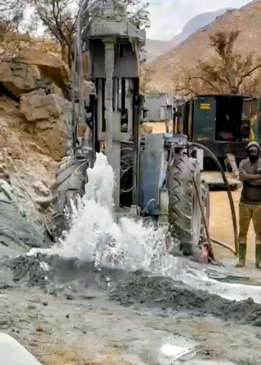 Le forage a été engagé sans attendre. Après quelques heures de tension et d'effort, la roche a cédé et la victoire est arrivée : un puissant jet d'eau a jailli du sol !
