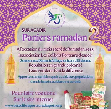 Le mois sacré de Ramadan est une période de réflexion, de partage et de générosité. Chez Les Colibris Porteurs d'Espoir, nous célébrons cet esprit de solidarité à travers notre initiative des "Paniers Ramadan". Cette année, nous avons à cœur de soutenir les habitants de Démunis Village, situé dans la région d'El Khoms, en leur apportant espoir et aide précieuse.